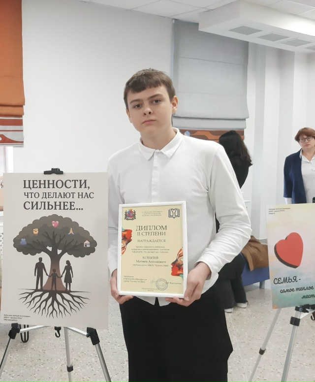 Обучающийся 8 «Б» Кобызев Матвей стал призёром (лауреатом II степени🥈) городского конкурса мотивирующих цифровых постеров «Ценности, что делают нас сильнее», основной целью и задачами которого являлось популяризация традиционных семейных ценностей (взаимопонимание, уважение, преемственность поколений) через современные форматы визуальной коммуникации, а также стимулирование осмысления роли семьи в формировании личности, укреплении социальных связей и психологической устойчивости.