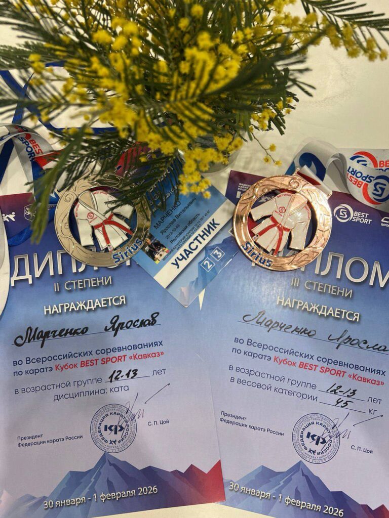 Всероссийские соревнования 🏆«Best Sport-Кавказ» , федеральная территория Сириус, г.Сочи 30 января-1 февраля Марченко Ярослав, ученик 7 «А» класса занял 2 место в ката среди мальчиков 12-13 лет🥈, а также 3 место в кумитэ(-45) среди мальчиков 12-13 лет🥉