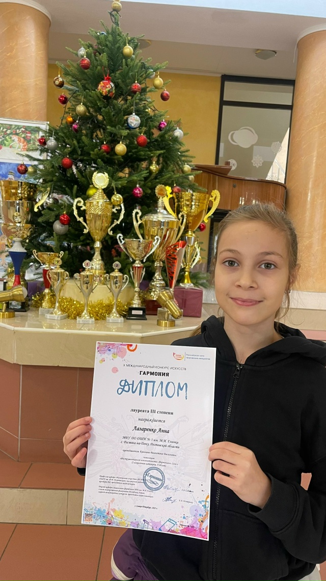 Лазаренко Анна, обучающаяся 4 б класса стала призером Международного конкурса искусств «Гармония» в номинации «Инструментальное исполнительство»